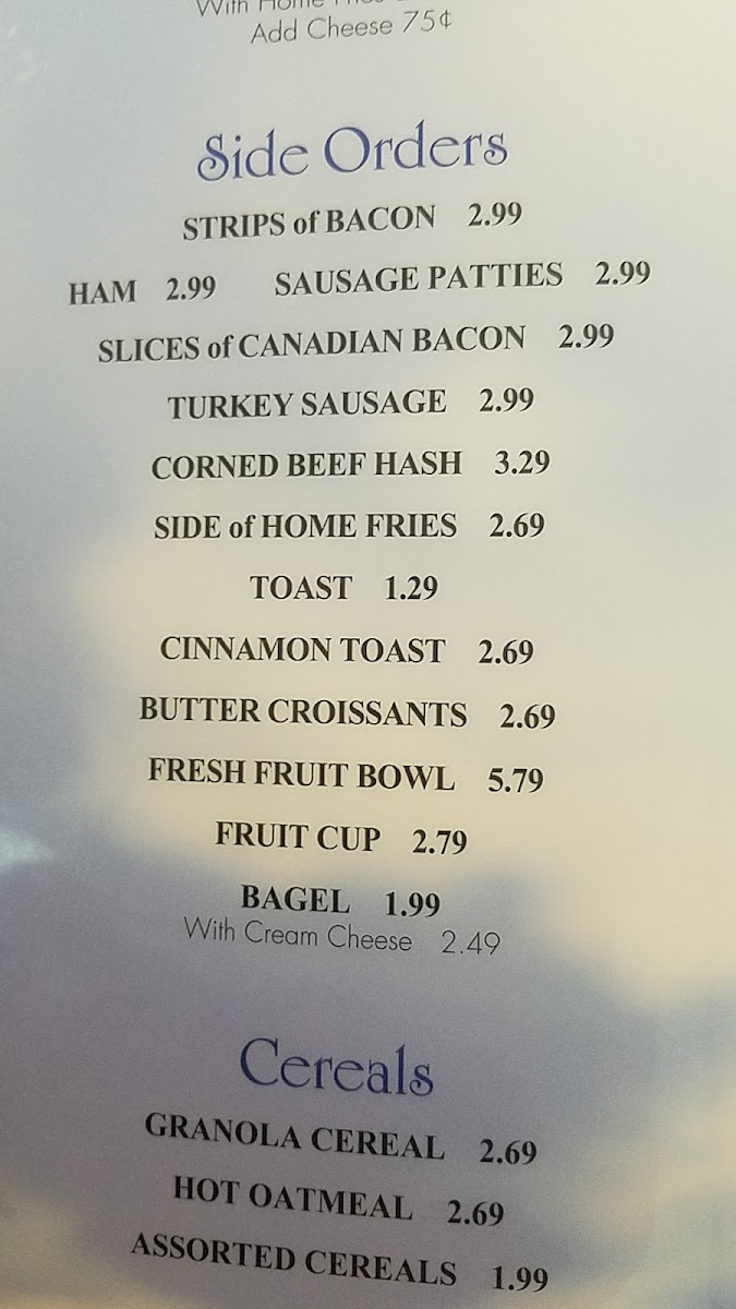 Typical offerings include warm soups like Chicken Noodle or French Onion, filling entrees such as Italian Meatloaf Parmesan with spaghetti, and traditional breakfast plates featuring eggs cooked your way with various skillets and sides. Whether you’re stopping in early for a Blue Sky Breakfast Wrap or settling down later for a Philly Cheese Steak Supreme or a Roast Beef Dinner, the menu caters to those who appreciate generous portions and straightforward, flavorful dishes.